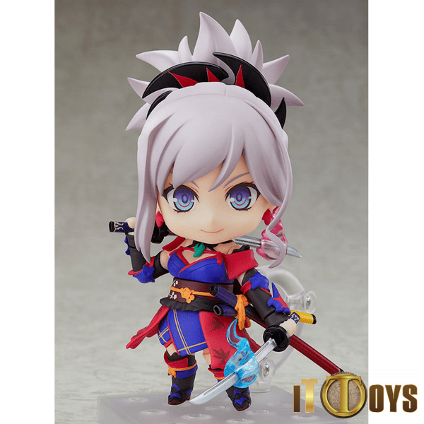 From the popular smartphone game "Fate/Grand Order" comes a Nendoroid of "Shinmen Musashi-no-Kami Fujiwara no Harunobubu" or as she is better known, Saber/Miyamoto Musashi! She comes with three face plates including a standard expression brimming with self-confidence, an ambitious combat expression as well as a kittenish expression for when she has her favorite food.